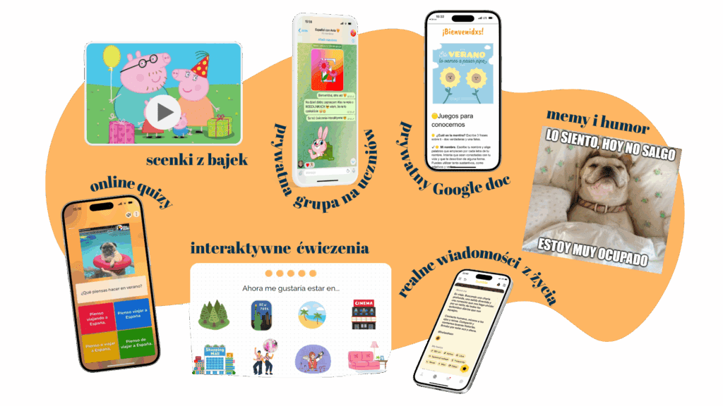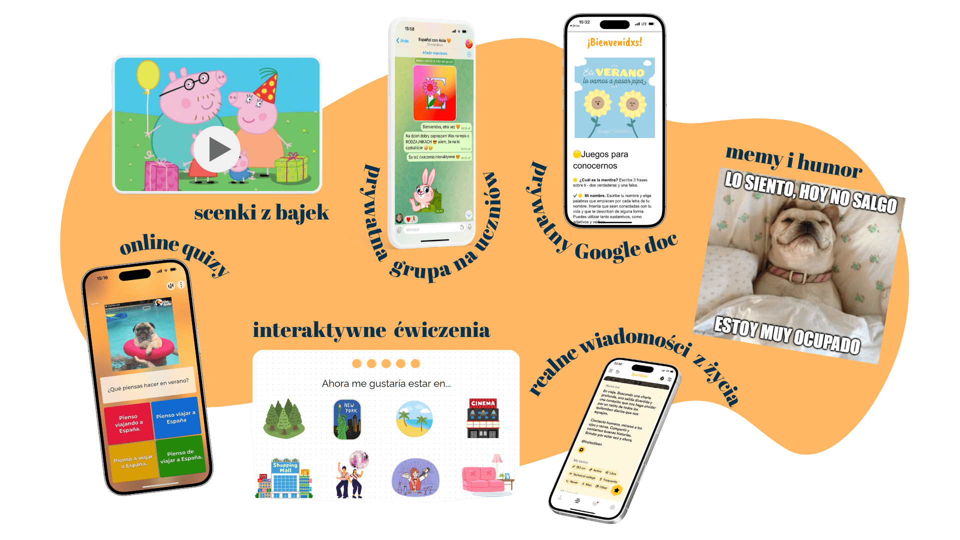 Hiszpański online nigdy nie był prostszy! Zapisz się na lekcje, by uczyć się hiszpańskiego w przyjemnej atmosferze i z humorem. Czekają na Ciebie memy, filmiki, autentyczne wyrażenia z hiszpańskich seriali, piosenki, bajki i dużo mówienia. Zobacz sam@, uczymy się ze świnką Peppą, bohaterami hiszpańskich seriali i Valerii, prognozą pogody prosto z hiszpańskiej telewizji, muzyką oraz autentycznymi wiadomościami od moich przyjaciół z Hiszpanii. Na lekcji gramy w Kahoota, a w domu uczysz się słówek z przygotowanych przeze mnie wirtualnych fiszek. Nie zdążysz się znudzić!