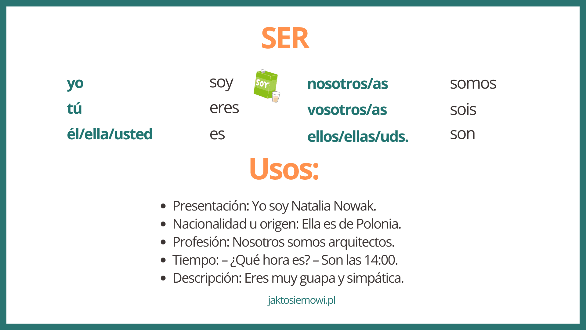Skąd jesteś? To pytanie usłyszymy na pewno na początku naszej drogi w nauce hiszpańskiego. By odpowiedzieć na to pytanie, musisz przyswoić sobie odmianę czasownika „ser”, czyli „być”. Tutaj możesz zapoznać się z dokładnym wpisem, w którym omawiam różnice pomiędzy czasownikami „być” w hiszpańskim (tak! w hiszpańskim istnieją dwa czasowniki „być”). Możesz też pójść na skróty i zerknąć na poniższą tabelkę z odmianą: