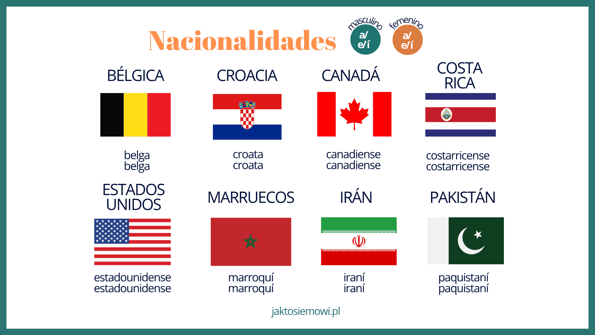 Ostatnia grupa to narodowości, które mają taką samą formę dla rodzaju męskiego i żeńskiego. Zorientujesz się, że to ta grupa, kiedy zauważysz, że rodzaj męski jest zakończony na -a, -e lub í. Nic nie zmienimy w rodzaju żeńskim.