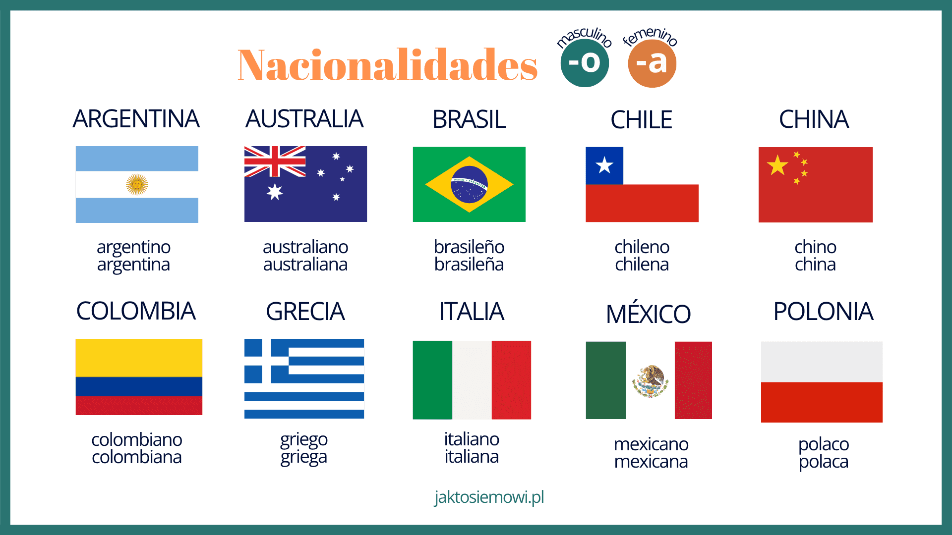 To największa i najłatwiejsza grupa narodowości. Rodzaj męski kończy się na -o, więc by stworzyć rodzaj żeński wystarczy podmienić -o na -a. Ten schemat powieli się też przy nazwach zawodów (médico → médica) , czy przymiotnikach opisujących osoby (guapo → guapa).