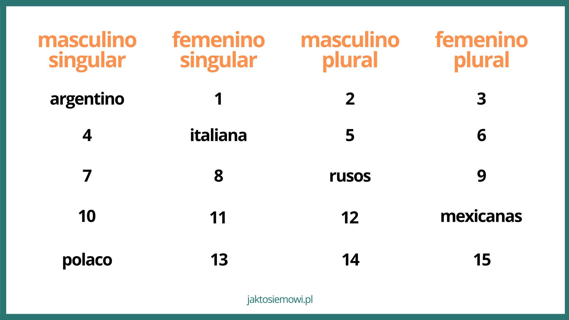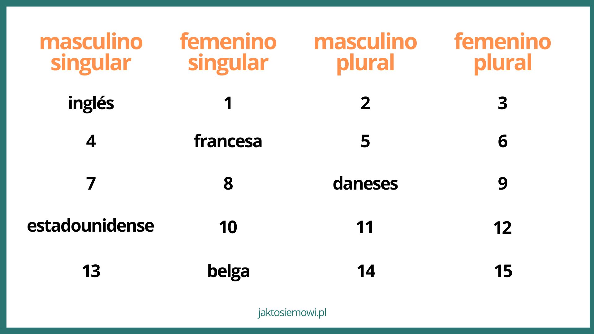 💡 Zwróć uwagę, że w wielu przypadkach zmienia się też akcent graficzny – w formie żeńskiej często go już nie ma, np. francés → francesa.